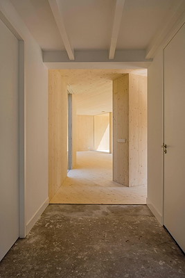 De vloeren, wanden en het dak van de uitbreiding zijn volledig van massief hout, dat aan de binnenzijde onafgewerkt in het zicht is gebleven. Met uitzondering van de schuifpui zijn er geen kozijnen toegepast. Het glas is rechtstreeks in het massieve hout geplaatst. Er is geïsoleerd met