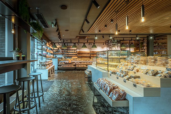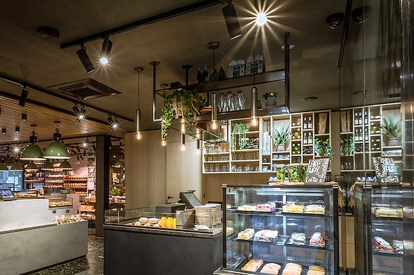 Beton-ogend plafond voor Bakkerij & Lunchroom