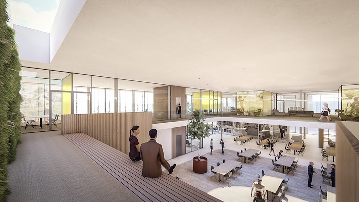Het interieur van het gebouw ademt een warme en open sfeer, waarin ontmoeting het centrale thema vormt. Op alle niveaus is dit thema van ontmoeten en inspireren doorgevoerd, georganiseerd rondom de centrale ontmoetingsruimte en podiumtrap. Informele werkplekken, koffiecorners en transparante puien zorgen voor optimale interactie tussen de medewerkers.