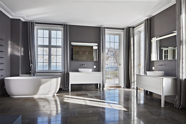 De in totaal 14 badkamers onderstrepen de exquise stijl van het pand. Passend bij het klassieke, moderne interieur zijn ze volledig uitgerust met producten uit de Luv-serie: ovale waskommen gecombineerd met consoletafels en ovale ligbaden. De badkamerserie combineert Scandinavische elegantie met zachte kleuren en is ontwikkeld door Duravit in samenwerking met Cecilie Manz. De internationaal succesvolle ontwerpster behoort tot de nieuwe generatie Deense ontwerpers die het Scandinavische designerfgoed vol vertrouwen voortzetten met verfijnde ontwerpen. Het feit dat Cecilie Manz in 2011 de Thorvald Bindesbøll Award ontving, is een interessante link naar de bewogen geschiedenis van "Strandridergården".