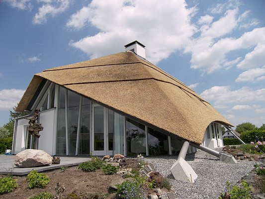 Het antwoord was een gedrapeerde rieten deken. Niet zonder gevolg; In 2009 ontvingen wij de architectuurprijs Amersfoort en is de woning, blijkens heel veel reacties in alle jaren, onbedoeld uitgegroeid tot een Amersfoort icoon.