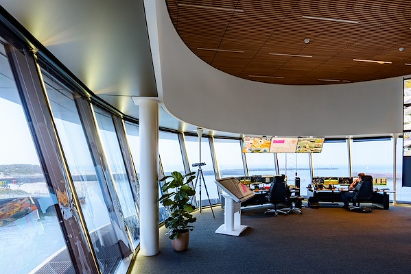 Door de sokkel kleiner te houden, blijven de zichtlijnen vanaf de boulevard intact. Het schip is zoveel mogelijk richting zee getrokken, zodat de medewerkers vanuit het gebouw goed en vrij uitzicht hebben om de schepen in de gaten te kunnen houden.De werkzaamheden in het gebouw gaan 24 uur per dag door. Medewerkers kunnen onder het gebouw parkeren om de boulevard vrij van voertuigen te houden. De ingang van de garage bevindt zich op kadeniveau en de parkeergarage is daardoor niet zichtbaar vanaf de boulevard.
