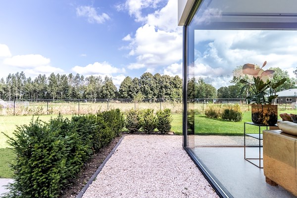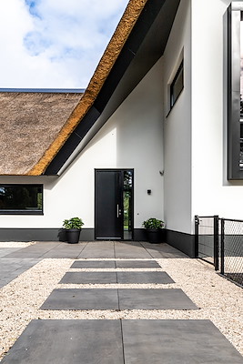 In het buitengebied van de Achterhoek mochten wij deze verrassende woning ontwerpen. De basis voor het ontwerp was de rieten kap die als een deken alle leefruimten met elkaar verbindt. Door de kap aan de voorzijde diep door te laten steken vloeit het landschap natuurlijk over in de kapvorm. Het hoofdvolume van de woning heeft een aan twee zijden overstekende kap die in een punt wegloopt. Dit in combinatie met de haaks daarop doorlopende kap zorgt ervoor dat de woning vanuit alle hoeken steeds een andere uitstraling heeft. De woning is zo ontworpen dat deze levensloop bestendig is, hierdoor is het mogelijk dat de leeffuncties naadloos in elkaar overlopen. Het hoofdhuis is volledig wit gestuct met een donker gestuct trasraam wat de woning een stijlvolle uitstraling geeft. Het aan het hoofdhuis geschakelde bijgebouw is voorzien van zwarte houten gevelbekleding.