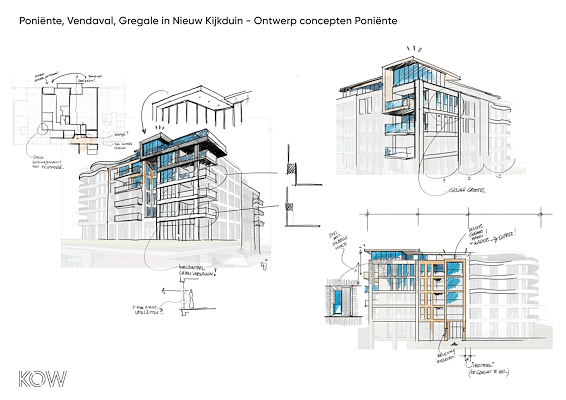 KOW heeft in samenwerking met TconcepT, Jan des Bouvrie en Piet Boon de eerste drie gebouwen van Nieuw Kijkduin ontworpen. Het materialenpalet is afgestemd op de kleur van strand en schelpen. Hiermee nestelen de gebouwen zich in de duinen. De gebouwen Poniƫnte, Vendaval en Gregale zijn elk ontworpen met een eigen uitstraling, maar vormen door gebruik van het hetzelfde lichtkleurig palet ook een eenheid.