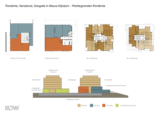 In PoniĆ«nte komen op de hoek van de boulevard en het Deltaplein 28 luxe appartementen. VariĆ«rend in grootte van 100 m2 tot penthouses van 180 m2 GBO. In de plint komt verdeeld over twee lagen 3.600 m2 aan vloeroppervlak bestemd voor retail en horeca. In de geschakelde blokken Vendaval en Gregale aan de promenade en het Deltaplein komen verdeelt over vijf woonlagen 80 huurappartementen van 57 tot 130 m2. In gedeelde plint komt op de begane grond een supermarkt van 1.000 m2 met daartegenover Foodmarket āDaily Tasteā van 1.400 m2.