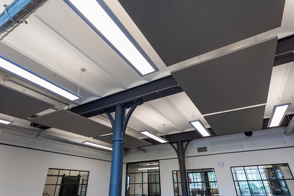 “De montage van de panelen is verricht door Fluxus zelf. Van een aantal ruimtes zijn de plafonds voorzien van geluidsabsorberend melamineschuim Flamex. We hebben op de platen een akoestisch open coating in de kleur van de plafonds aangebracht. Die verflaag doet nauwelijks afbreuk aan de akoestische eigenschappen van de platen”, aldus Hans Meerbeek, accountmanager van Merford. Hij vervolgt: “In de ruimtes met gewelfde betonplafonds was het rechte melamineschuim geen optie. Hier adviseerden we akoestische plafondeilanden van het type Silent Office. Fluxus zocht zelf een kleur uit die goed aansluit bij het karakter van de ruimtes.”