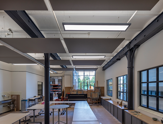 Sterke nagalm, veroorzaakt door reflecterend geluid op harde oppervlakken, is niet aangenaam wanneer je een taak verricht die veel van je aandacht vraagt. Zo werd het ook ervaren bij Fluxus, het centrum voor de kunsten in Zaandam. Kort voordat de stichting haar nieuwe locatie in de gerenoveerde 19e-eeuwse Verkadefabriek opende, werd contact gezocht met Merford om een oplossing voor de slechte akoestiek in de danszalen en lokalen voor beeldende kunst te vinden. En die oplossing kwam er. De geluidsabsorberende panelen reduceren de nagalm en doen tegelijkertijd geen afbreuk aan de authentieke sfeer in het bijzondere pand.