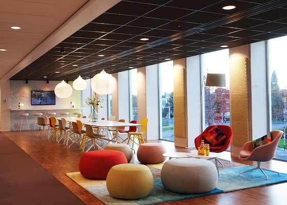 De publieke ruimte op de begane grond, is een echte open ontmoetingsplek geworden waar de Rabobank zijn gasten waarlijk ontvangt.