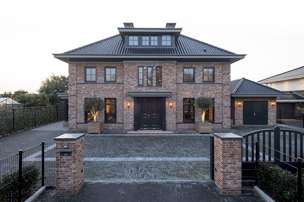 De combinatie van de materialen is smaakvol. De architraaf bij de voordeur is gemaakt van WesternRed Cedar hout, rustend op Belgisch hardsteen. Ook de waterslagen en spekbanden zijn gemaakt van Belgisch hardsteen, daaronder bevindt zich een klassieke rollaag in metselwerk. Boven de kozijnen op de begane grond is de rollaag gemetseld in een zeer kenmerkende en klassieke hanenkam. Er is een grillig gevormde, gemêleerde baksteen toegepast, met een zandkleurige voeg. De HEBO-kozijnen zijn geselecteerd op het harmonieus integreren in het gevelbeeld. Een extra detail wordt gevormd door de zonwering, die met het kozijnis mee geplaatst en volledig is ingebouwd.
