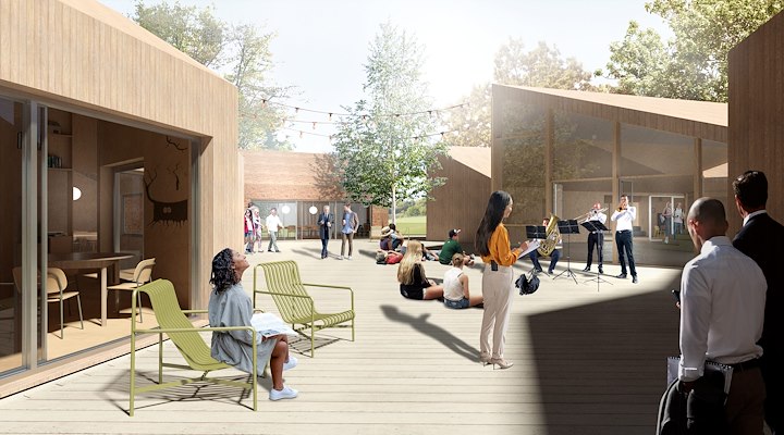 , en waar vrijkomende materialen uit de oudbouw worden hergebruikt in een aantal nieuwe circulaire leerpaviljoens.