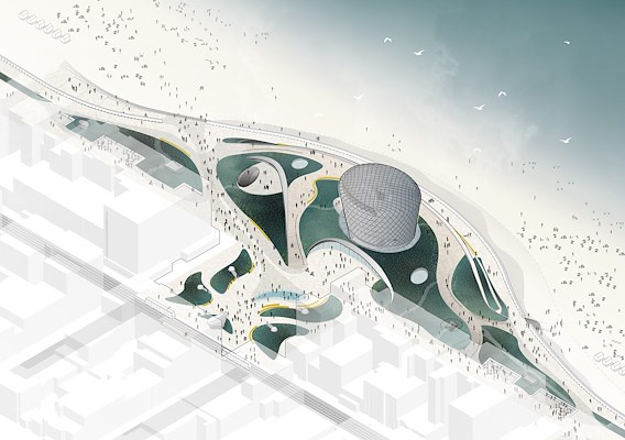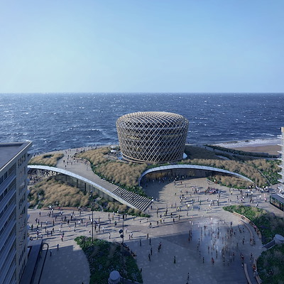 Met ons ontwerp wordt het duinlandschap in ere hersteld. Het drie hectaren tellende duinlandschap geeft bezoekers de kans om tussen het helmgras, duinriet en zandhaver te grasduinen. De geul komt terug in de vorm van een dynamisch waterelement dat ontspringt op het Epernayplein en bezoekers langs een brede stroom richting zee leidt. De zeedijk dikt ter hoogte van het casinogebouw op, waarbij een glooiend, duinvormig talud dient als robuuste kustbescherming.
