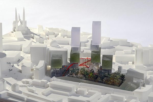 De hoge bomen en het weelderige groen zorgen voor een geleidelijke overgang tussen de gevarieerde hoogbouw en de lagere bebouwing rondom het plan, en halen een deel van de bebouwing op een natuurlijke en subtiele wijze uit het zicht.Het groen verbetert de lokale luchtkwaliteit en zorgt voor een koele en schaduwrijke plek midden in het bruisende stadscentrum.