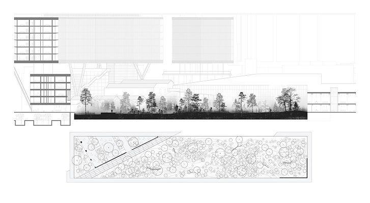 Met dit eerste stadsbos in Eindhoven voegen we een groot stuk natuur toe dat in de volle grond zal worden aangeplant, waarmee het bestendig is om zich honderden jaren te ontwikkelen. In combinatie met de heidedaken bovenop de gebouwvolumes creëren we een spectaculaire groene plek die bijdraagt aan de fysieke en mentale gezondheid van bewoners en bezoekers. Via de looproute The Loopkunnen bezoekers door de gehele ontwikkeling lopen en is het bos op de begane grond met de verschillende groene dakterrassen op hoogte verbonden. De groene ruimtes gaan in dialoog met elkaar en zetten een nieuw ecologisch systeem midden in de stad op.
