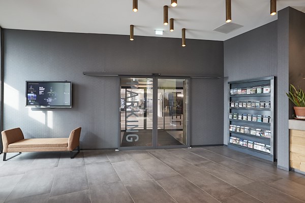 naar de entree van de parkeergarage is brandwerend en voorzien van een unieke betonlook waardoor de aandrijving perfect aansluit bij de look & feel van de omgeving. De Slimdrive wordt standaard geleverd in een EV1 uitvoering maar is in alle gewenste RAL kleuren verkrijgbaar zodat de schuifdeur onderdeel wordt van de gevel of de binnenruimte. Door zijn slanke design met een aandrijfhoogte van slechts