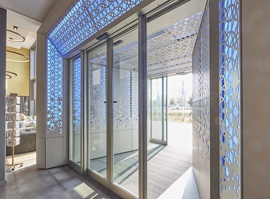 gekozen. De hoofdingang heeft een dubbele schuifdeur zodat er een sluisfunctie ontstaat. Een sluisfunctie zorgt er ervoor dat in de zomer warmte wordt buiten gehouden en in de winter de kou en draagt dus o.a. bij aan energiebesparing.