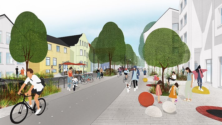 Door het straatprofiel te versmallen en de snelheid te verlagen, ontstaat ruimte voor een comfortabele fietsroute in beide richtingen. Aan weerszijden van de Nadorster Straße ontwierpen wij een flexibele, adaptieve zone met een stevige rij bomen en langgerekte beplantingsstroken en daartussen flexibele velden die inhaken in op het al aanwezige programma en kunnen meeveranderen met nieuwe behoeften in het gebruik van de openbare ruimte. De al bestaande kleine pleintjes worden bij de voetgangerszone betrokken en met extra bomen en zitplekken ingericht. Op deze manier ontstaat een gezellige, dynamische straat waar mensen kunnen wandelen, fietsen en elkaar ontmoeten op de talloze verblijfsplekken.