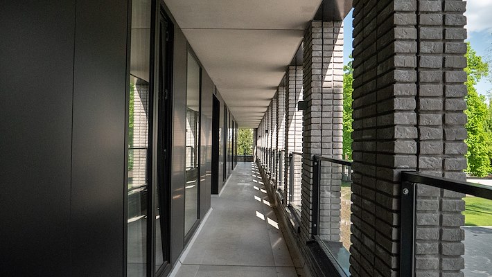 On a trip to America in 1919, the wife of Dutch textile manufacturer Swagemakers discovered the Robie House by Frank Lloyd Wright and was really impressed. So it is no coincidence that “De Lange Akker”, the grand family residence built in Tilburg in 1920, appears to soar over the flat landscape like its American counterpart, with its staggered, horizontally projecting roof sections, its long strips of ribbon windows and horizontal cornices. A century later, the building, which used to be a luxurious home, has become a barrier-free, accessible living space for senior citizens. The architects repurposed the protected building with particular care: four new additional buildings flank the existing building, reiterate its original architectural concept and turn it into contemporary architecture. The architects also emphasised the horizontal façade structure by incorporating ribbon windows, arcades, wide balconies and projecting roofs. They selected rough, narrow brick for the façade based on Wright's model. The closed parts of the window bands and arcade areas have been clad using ALUCOBOND® Anodized Look tray panels. The dark anthracite colour gives the impression that the windows are receding into the façade and emphasises the light-coloured brickwork, creating horizontal divisions between the storeys. In this particular case, living with history refers not only to the listed building but also to the surrounding countryside. A number of historic parks and Tilburg stately homes are located in this area. The building’s panoramic windows, its open spaces, its access areas, including open or fully glazed staircases, always relate to the open landscape. They create visual bonds with the old trees and communication spaces for the residents. The building and the paths seem to be anchored deep within the garden, giving residents a sense of steadfastness, greater privacy and unusual viewpoints. This fusion between enduring nature and soaring horizons inspired the wealthy residents of Brabant and their architects in the past; it still inspiring today.