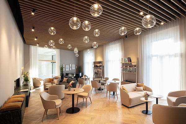 De Waldkliniek in Eisenberg wordt gekenmerkt door duurzaamheid en een esthetisch doordacht interieur. Hier heeft ook het tijdloze LS 990 van JUNG zijn plek gevonden en is in het hele gebouw toegepast en alpine wit en in Messing antiek. Bijzonder: bepaalde schakelaars zijn voorzien van het logo van de kliniek.