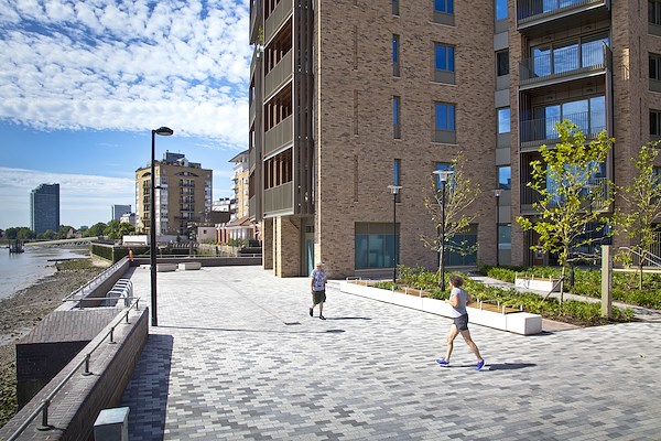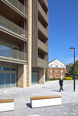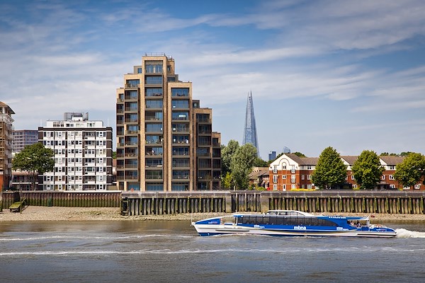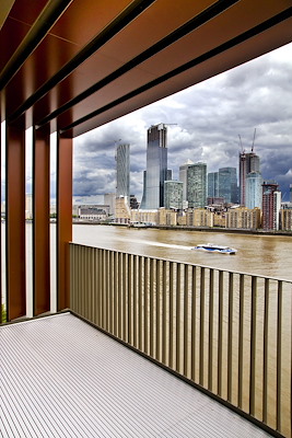 The Greater London population is approximately nine million and more people are moving into the city every year. But building land remains scarce, despite the Docklands regeneration project which provided a great deal of inner-city space for redevelopment many years ago. Where men with calloused fingers used to load wood and bulk cargos, more and more residential and office towers have been built over the last thirty years or so, and with them property prices have soared. These properties compete for the best, unobstructed view of the River Thames. Offering river views was also crucial for the architects of New Pier Wharf. They have staggered and tiered the building in such a way that all residents in the slender tower either have an unobstructed view of the river or look out over the city centre skyline and can see treetops in the local park. Most of the flats even offer a vista of both. This is thanks to the unusual, step-like and staggered format of the volume, which ensures well-lit, very functional floor plans and makes the absolute most of the space and views. The architects chose a slender, yellow-brown, brick for the façade, typical in London and similar to the material used in neighbouring buildings and numerous workers' homes on the outskirts of the city. They opted for brass-look ALUCOBOND® tray panels cladding for the window parapets and the sides of the balconies to add a sophisticated shine and to contrast with the rough brickwork. The architects’ façade design has touched on the essence of the Docklands transformation: new, chic and gentrified properties in areas of London which were once rough and dirty. They have fused the myth of the down-to-earth, rough and ready working class city with the capital which is simultaneously traditional and class conscious yet hip. Anyone who takes the kilometre-long river promenade following every loop of the Thames, inevitably passes this building. Visitors can take a break on the ground floor terrace of the Tower, look across the Thames to Canary Wharf on the opposite bank and marvel at how London has grown and reinvented itself within a mere three decades.