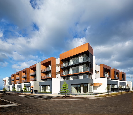 New solutions are required urgently not only for high density living but also for low density living. Around Melbourne, for example, settlement areas are expanding across more land every year. There are approximately 4.3 million Melburnians living on 9,000 m², an area 10 times larger than Berlin and more sparsely populated. There is a huge suburban sprawl with ever growing commuter traffic jams. As the task of urban densification for housing and infrastructure is difficult given the small-scale private plots, the city has opted for a new district in the southwest of the city, right on the shore of Port Phillip Bay. Here in Wyndham Harbour, the aim is to get things right from the very start: higher density living is created by building blocks of flats, terraced houses and townhouses; the shops, cafés and a harbour with its promenade add urban chic. The plan is to provide ferry transport so that, in the future, residents can travel to the centre quickly without a car. The Marina Quay apartment building, with shops and restaurants on the ground floor, is located directly at the harbour. It is designed to attract residents who, in the past, preferred to live in their own house with double garage in the Australian suburbs. The design of the concrete building’s façade is very important: by repeating certain elements, it resembles a row of terraced houses. The ground floor units are individually highlighted in anthracite. The two balconies above are both framed in ALUCOBOND® Natural Copper tray panels, contrasting with the concrete grey of the façade and the sea blue of Melbourne Bay. The result is a sophisticated and contemporary appearance, one well-suited to the suburban environment. The side of the building overlooking the harbour has a more urban feel and the part facing the promenade is formed like the curved bow of a yacht. The continuous row of balconies along the water’s edge is also framed to create one entity. The colour palette changes: The concrete borders on the upper floors accentuate the panoramic front, the anthracite and glass façade is set back a little. The vertical balcony partition walls and sun protection elements clad in ALUCOBOND® tray panels are subtle highlights and unify the different sides of the building within a common context.