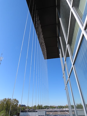 Bij dit kantoorpand in Amsterdam hebben wij 168 verticale RVS staalkabels met een diameter van 5mm aangebracht voor groenbegeleiding. Dit gaat op termijn 420m² verticaal groen opleveren. De staalkabels zijn aan de onderzijde direct in de grondbakken bevestigd. De klimplanten staan op de verdiepingsvloer in grondbakken.
