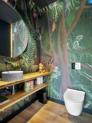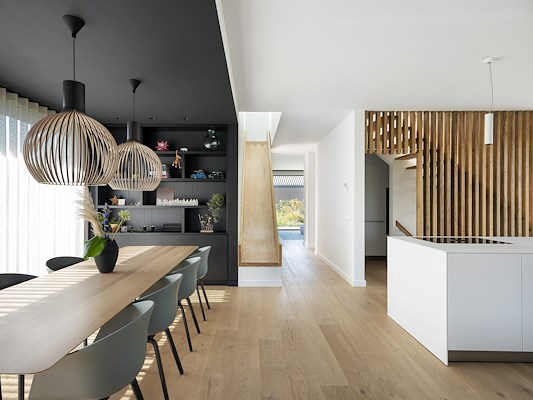 Op de begane grond is gekozen voor het creëren van aparte ruimtes voor de verschillende programma onderdelen, welke in open verbinding met elkaar blijven staan. Zo is er tevens een tv/speelkamer losgekoppeld van de woonkamer om zo ruimte te bieden voor het hele gezin zonder elkaar tot last te zijn. Op de verdieping zijn meerdere slaapkamers en badkamers te vinden welke via de hal gekoppeld zijn met de begane grond middels een glijbaan.
