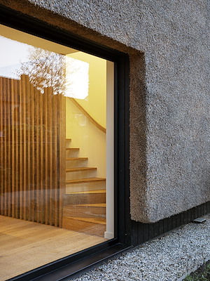 Als materiaal voor de hoofdvorm is gekozen voor riet, welke vanaf het dak verticaal naar beneden loopt als een deken over de woning. Als tweede materiaal is gekozen voor zwart hout met een open ventilerende structuur. Gezamenlijk vormen beide materialen voor een natuurlijk contrast en een perfecte inpassing van de woning op het kavel.