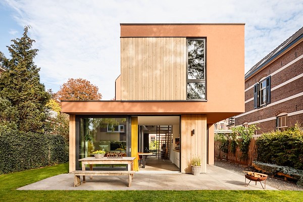 Door de smalle kavel is een ‘aparte’ voor- en achtergedeelte ontstaan. Het voorste gedeelte, is modern en traditioneel en voegt zich naar de straat. Het achterste gedeelte, de eetkeuken, heeft een speelse vorm en is naar de tuin gericht.