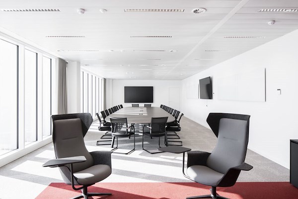 De boardroom of de masterroom van het gebouw. Een ruimte met eveneens uitzicht op de startbaan en wat nog dat tikkeltje meer mag hebben. De kleurindeling mocht hier net wat anders zijn, zonder de corporate identity uit het oog te verliezen. Met de integratie van zowel het logo als de Expeditors vlag op de raamfolie. En de rode wand die overgaat in de vloer, om zo de grote ruimte te breken.In de boardroom zijn de Klöber WOOOM loungefauteuils toegepast. Voorzien van draaibaar laptop blad, zodat informeel werken mogelijk is.De Klöber WOOOM is een duurzaam geproduceerde fauteuil waar het basismateriaal van de kuip bestaat uit deels hergebruikt petvilt.Rondom de boardroom tafel staan Klöber Orbit vergaderstoelen met netbespanning.De werkplekken op de verschillende kantoren zijn voorzien van Klöber Mera ergonomische bureaustoelen.