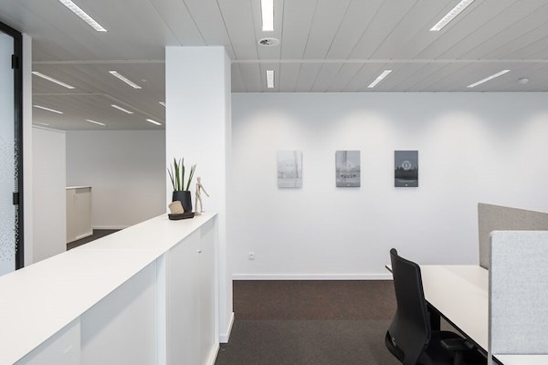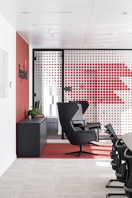 De corporate identity in dit project is terug te vinden in de wereldkaart aanwezig achter de balie, posters in frames bevestigd aan de wand verdeeld over alle verdiepingen die telkens een verschillende company value aanhaalt. En uiteraard het kleurenpalet: rood – zwart – wit vertaald in het interieur en meubilair. Zoals bijvoorbeeld de rode accenten verwerkt in de onderstellen van de werkplekken in de open space ruimtes. Individuele kantoren bevatten dan weer een rood accent in de kantenband van elk werkblad, en dat telkens op een andere plaats. Deze highlights voegen een 3de dimensie toe aan in het kantoor.