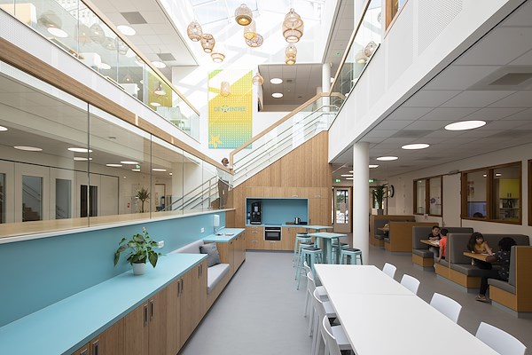 Het open onderwijsconcept komt terug in de opzet van het gebouw. Op de begane grond krijgt de onderbouw les en zijn het kinderdagverblijf en speeltaalhuis geplaatst. Een grote multifunctionele speelruimte positioneerden we tegenover de grote trap die ook als tribune of voorleesplek gebruikt kan worden. Op de eerste verdieping is de bovenbouw gevestigd met tegen de gevel aan de basis (instructie) ruimten. Met grote glazen schuifpuien zijn deze verbonden met het middengebied waar de leerpleinen zijn. Hier vind je de leerateliers en open samenwerkplekken. De ‘ontmoetingskeuken’ is letterlijk en figuurlijk de centrale plek in het gebouw. Ouders en kinderen komen hier samen om te koken. Het duurzame schoolgebouw biedt de kinderen en medewerkers flink wat ruimte die veel vrijheid biedt voor de gewenste flexibiliteit in onderwijsvormen. De vide en een riante lichtstraat zorgen voor veel daglicht dat tot diep in het gebouw doordringt.