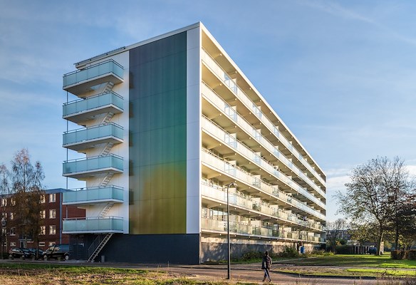 Op deze constructie zijn nieuwe Rockpanel Chameleon gevelpanelen gemonteerd, per flat in een eigen, unieke verlopende kleurstelling. De Wilde: “We zijn samen met onze opdrachtgever op zoek gegaan naar een gevelplaat die het pand een moderne, unieke uitstraling geeft. Toen we in de showroom van de dealer Rockpanel Chameleon zagen, waren we gelijk verkocht: door een slimme kristallaag zie je de gevel werkelijk van kleur veranderen als je erlangs loopt met telkens een andere lichtinval. Vanuit welke hoek je ook kijkt, je ziet geen moment hetzelfde. Ze geven het gebouw precies die moderne uitstraling die op deze locatie nodig is.”
