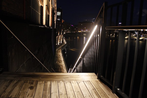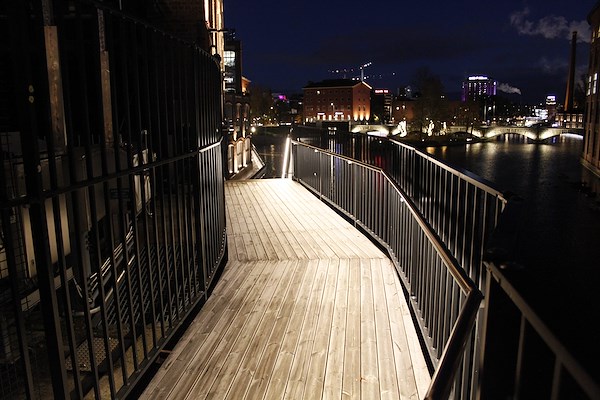 De liniLED® trapleuning met LED verlichting benadrukt het nationale landschap van Tammerkoski in Finland. Het ambitieuze verlichtingsproject werd afgerond met de innovatieve liniLED® Handrail met geïntegreerde verlichting, geleverd door onze partner Hedtec.