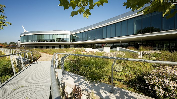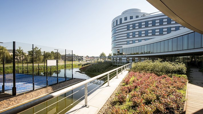 De hoger gelegen daktuin is voorzien van het ND 4+1h Drainagesysteem dat als onderdeel geldt van het ND Extensief Groendaksysteem. Hiervoor is gekozen omdat dit dak juist wel ontworpen is met afschot.
