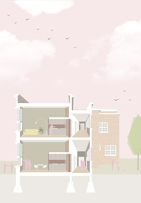 Door terug te gaan naar de heldere oorspronkelijke indeling van de school, met een brede gang aan de noordzijde en klaslokalen aan de zuidzijde, hebben we de specifieke ruimtelijke kwaliteit teruggebracht in de Driftkikker. Deze brede gang is tevens een prachtige ontmoetingsruimte voor de bewoners van de Driftkikker, een plek tussen de prive-ruimte van de woning en de openbare ruimte van de straat.