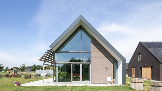 De eenlaagse woning is volledig in houtskeletbouw uitgevoerd en met vlas geïsoleerd. De afwerking van exterieur en interieur (deels) is uitgevoerd in onbehandeld inlands lariks. Een lichtstraat in de nok en ruime glazen puien brengen licht en lucht in de woning.