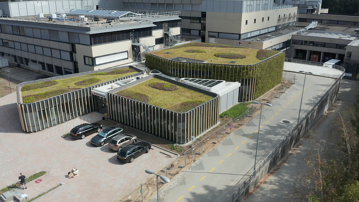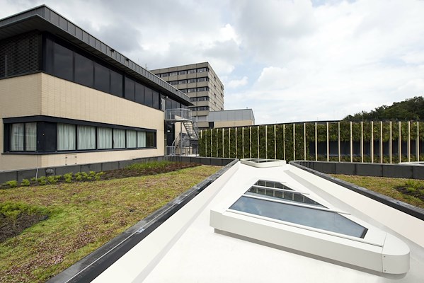 De groene gevel en groene daken geven het geheel een duurzame én natuurlijke uitstraling.