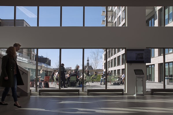 “De keramische facade prikkelt voortdurend om naar het gebouw te kijken”, licht architect Jeroen Geurst zijn ontwerp toe. “Hoe dichter je bij Het Wijnhavenkwartier in de buurt komt, hoe meer er te beleven valt. Van een afstand lijkt het gebouw egaal zandkleurig. Dichterbij tekenen zich door het tegelwerk spannende weefpatronen af. Op de facade van het hoofdgebouw zijn verticale lijnen dominant; in de laagbouw zijn de tegels in een horizontaal patroon verwerkt. Elke gevel is anders. Dat ook elke tegel een unieke kleurnuance heeft, wordt duidelijk vlakbij het gebouw. Al die details leveren bezoekers steeds extra informatie op. Dat maakt een gebouw in mijn ogen interessant.”