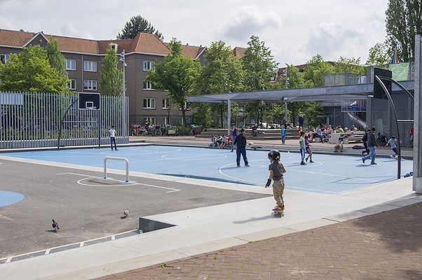 Het is een plan dat in nauwe samenwerking met de omwonende is ontworpen. Belangrijk was dat het een groen plein zou worden met veel mogelijkheden voor gebruik. Voor elke leeftijdsgroep diende er een verblijfskwaliteit gegenereerd te worden. Het overgrote deel van de bestaande bomen diende gelukkig gehandhaafd te blijven. Dit lukte door de parkeergarage binnen het bestaande bomenrechthoek te situeren. Hierdoor krijgt het plein al vanaf de aanleg een zeer groen beeld. Dit wordt nog eens versterkt door het situeren van grote plantvakken die vanaf de gevels het plein oprukken. Het plein is in tweeën gedeeld. Een groot open plein waar verschillende sporten beoefent kunnen worden aan de Van Halstraat en een besloten, kleinschalige, lommerrijke ruimte waar een speelplek voor de jongere kinderen is gesitueerd. De verschillende speelplekken zijn ontworpen door Carve Ontwerp en Ingenieursbureau. Het plein krijgt ook een tienercentrum, gelegen aan de Van Halstraat en een beheerdersruimte met theehuis. Deze gebouwen en de voetgangersingang van de parkeergarage zijn ontworpen door Concrete.