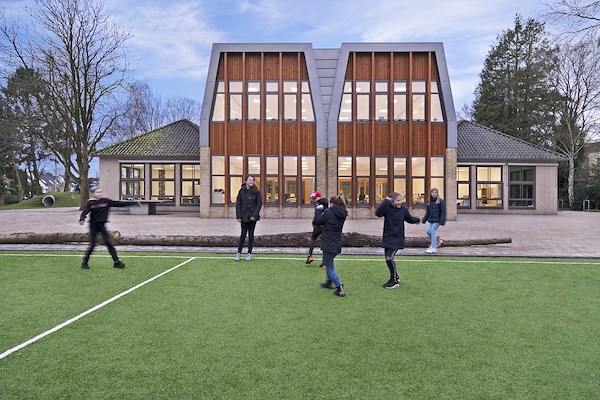 Voorafgaand aan het ontwerp zijn alle uitgangspunten vertaald in een integraal programma. Daarnaast zijn er diversesessies met betrekking tot de gezamenlijke onderwijsvisie geweest. Als bureau hebben we de waarde vanhet gebouw in kaart gebracht. De school is gebouwd in de periode van de wederopbouw en is binnen Loosdrechteen kenmerkend gebouw voor die periode. Daarnaast is de school sterk verweven met de buurt. Hoewel de schooloorspronkelijk is gebouwd in een H-vorm is het niet een archetypische H-school zoals we die kennen uit de gemeenteAmsterdam. Niettemin zagen wij voldoende aanleiding om de oorspronkelijke structuur in ere te herstellen, uit tebreiden en zelfs te versterken ten gunste van het programma. Dit hebben we gedaan door de twee oorspronkelijke langgerekte gebouwen van de H-vorm te verlengen in de oorspronkelijke architectuur. Tussen deze twee bouwdelenhebben we het benodigde programma toegevoegd over twee bouwlagen. Daarbij hebben we in de vormgeving naarrepetitie gezocht door de toevoeging van twee extra langgerekte “beuken” met in het midden ruimte voor de centraleleerpleinen. Door deze benadering bleef er ook veel ruimte voor het speelplein beschikbaar.