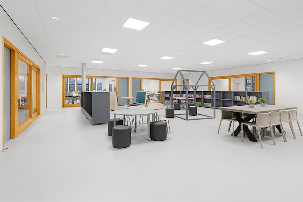 Vanuit de onderwijsvisie was er de wens om buiten de groep op gezamenlijke leerpleinen groepsdoorbrekend thematischonderwijs te kunnen geven. Desondanks was er ook koudwatervrees om het klassikaal onderwijs definitief te verlaten.Daarnaast was de structuur van het gebouw niet erg geschikt om deze aan te passen naar de kleinere eenhedendie passen bij deze onderwijsvorm. Omdat het hier een renovatie betrof hebben we dit nadeel weten om te zettenin een voordeel. Financieel bleek het uiteindelijk haalbaar de klassikale structuur te handhaven en alle groepsruimtenhaaks te positioneren op gezamenlijke leerpleinen voor de onder- midden en bovenbouw. In de uitwendige hoeken ende kernen kwam het ondersteunende programma. Op deze manier konden we de twee tot vierjarigen koppelen aande onderbouw op het speelplein, de middenbouw heeft een dubbelfunctie met de BSO op het werkplein en de bovenbouwheeft haar eigen leerplein. De koppeling vindt plaats met grote schuifpuien. De nul tot tweejarigen zitten rustigaan het uiteinde in een apart deel van het gebouw.