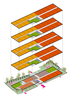 Omdat ontmoeten centraal staat is gekozen voor een corridor ontsluiting met een centrale entree. Door de corridor kunnen de bewoners comfortabel gebruik maken van de ontmoetingsruimte en de gezamenlijke tuin. Daarnaast is een gemeenschappelijke logeerkamer en een scootmobielstalling in het gebouw opgenomen.