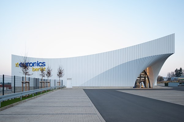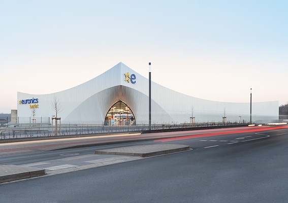 There may be no polar bears around, but there is an iceberg in Westphalian Sauerland, more precisely in Neheim. A newly built consumer electronics store has been given a remarkably sophisticated silhouette. The building stands in a prominent position at the entrance to town on an asymmetrical plot of land with a steep downward slope on the narrow side. A tricky site for a building with a large footprint. The architects duplicated the diagonal format in their ground plan, elevated the rear of the building on the west side and followed the curving line of the road on the east-facing side of the building. They opted for narrow ALUCOBOND® tray panels, measuring up to eight and a half metres long, in spectra White Gold for the façade. The panels were installed on a steel substructure in rows but staggered in terms of depth. This allowed the architects to emphasise the volume and create a façade with real character. Above the entrance, the construction soars almost eleven metres aloft and protrudes to form an acute angle. The architects used the building’s apex to mark the most important position in the façade and, at the same time, to create ample height for an outsized, sacred-looking, arched front entrance. Here too, the subtle longitudinal twist, fan-like slant, and neat alignment of the ALUCOBOND® tray panels fashion a complex, symmetrical, decorative relief and create two sharp, curvilinear edges in the façade. Precision work on this level requires accurate planning, production and assembly of the panels. As the building is so tall, the smallest inaccuracies when aligning the joints would have led to large gaps at another point. The ethereal iridescence and fan-shaped folding of the white-gold ALUCOBOND® panels mean the immense building changes depending on the viewer’s perspective. The result is a glittering iceberg with a sharp break-off edge. Its shadows wax and wane throughout the course of the day, melting into the grey dusk but never melting in the sun’s rays.