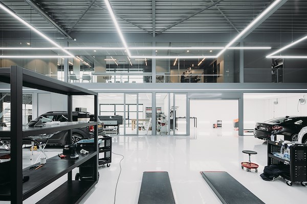 De tweedeling tussen de werkzaamheden in de werkplaats en op kantoor, vormde voor Van Hees het uitgangspunt voor het ontwerp. Letterlijk knipte ze de ruimte in twee delen. Waarbij de bedrijfsvloer – hier worden de auto’s ‘ingepakt’ – een stoere industriële uitstraling kreeg. Met lichte grijstinten waardoor de werkzaamheden in de spotlight staan. Het gedeelte waar klanten worden ontvangen en de kantoren zijn gevestigd is gehuld in een geraffineerde zwarte afwerking.