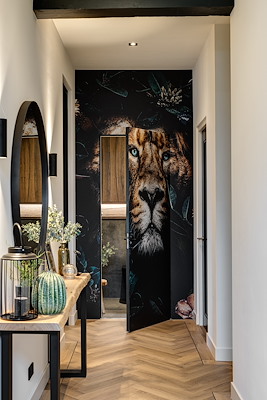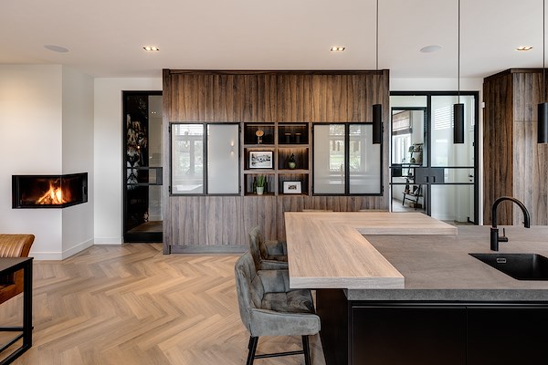 Al deze glazen deuren, ook die in de op maat gemaakte kast in de keuken, hebben een zwart stalen frame. Deze herhaling van de stijl geeft de woning een eigen en eenduidige stijl. Daarom is dezelfde stijl ook doorgezet in de accenten die gezet worden door de verlichtingsarmaturen en het schakelmateriaal.