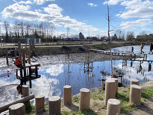 Natuurlijk moest het wel een veilige speelvoorziening worden, maar zeker niet voorspelbaar. Dus hebben we in het midden van de retentievijver een verhoging aangebracht ten behoeve van twee oversteken: een avontuurlijke en een vlonderpad. Doordat het waterpeil in de retentievijver varieert van droog tot ca. 30 cm water zijn de omstandigheden dus ook nooit dezelfde. Soms kunnen kinderen met hun voeten in het water komen en dus niet altijd schoon blijven. Immers, zonder een beetje vies te worden kom je nergens …”.