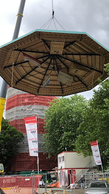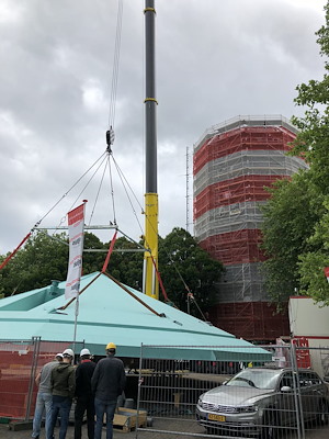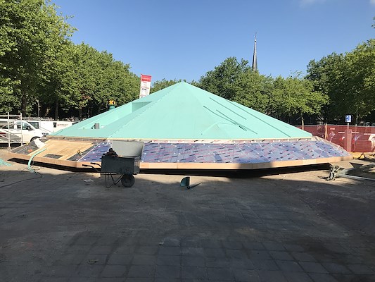 De RENOLIT ALKORDESIGN dakbaan bleek de meest geschikte keuze. Vooral door de gewenste patinagroene kleur, maar ook de flexibiliteit van het materiaal, de eenvoudige installatie en het gunstige prijskaartje speelden mee. Voor de installatie van het dak sprak Nijhuis Bouw BV het dakdekkersbedrijf Rudde Dakbedekking uit Nijverdal aan, een betrouwbare partner met vele jaren ervaring. De 1,5 mm dikke polyesterversterkte pvc dakbaan werd mechanisch bevestigd in de houten ondergrond en mooi afgewerkt met bijhorende RENOLIT ALKORDESIGN dakprofielen. Dankzij deze imitatie staande naad profielen behoudt de dakkoepel de uitstraling van een verweerd koperen dak.