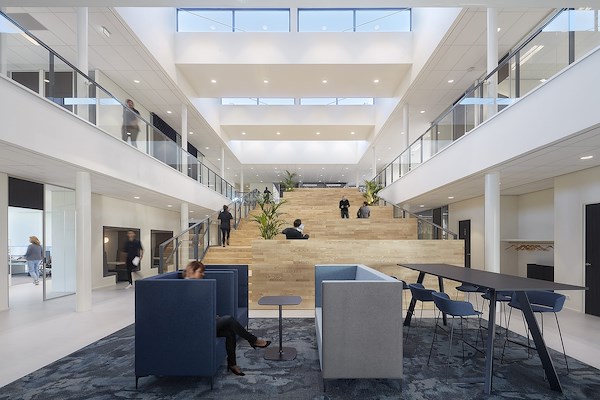 De open en uitnodigende uitstraling van het exterieur wordt weerspiegeld in het interieur. De nieuwbouw faciliteert samenwerking en ontmoeting. De plattegronden van het kantoorgebouw zijn in nauwe samenwerking met de medewerkers en afgestemd op de onderlinge relaties van afdelingen ontworpen. Er is, gebaseerd op het principe van Activiteit Gerelateerd Werken, een diversiteit aan open en gesloten overleg- en werkplekken. Van kantoortuin tot concentratieplekken, van aanlandplekken en informele zitjes tot (grote) vergader- en trainingsruimten. Het interieur is in samenwerking met ZwaagInterieur zorgvuldig uitgewerkt met aandacht voor details. De inrichting markeert functie, de gekozen materialen zijn uitnodigend en comfortabel. Groene afscheidingen en glazen tussenwanden verbinden de ruimtes en reguleren de akoestiek. Want in het ontwerp is veel aandacht besteed aan een gezonde, vitale en duurzame werk- en leefomgeving. Voor een optimaal werkklimaat kan het balansventilatiesysteem per ruimte naar wens worden ingesteld.