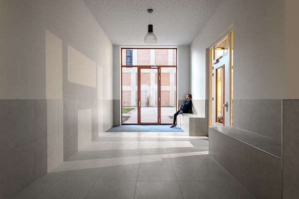 ruime entreehal als ontmoetingsruimte en verbinding tussen straat en collectieve binnentuin