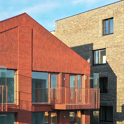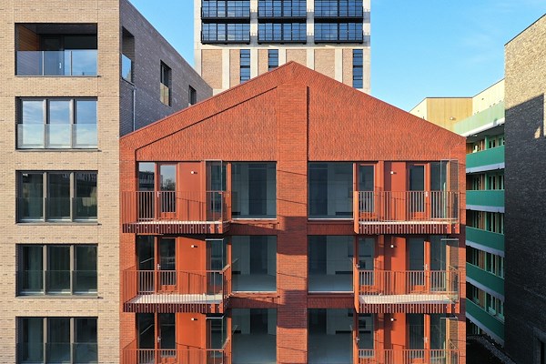 De combinatie van het rood gevoegde metselwerk, de rode kozijnen, hekwerken en beplating heeft geresulteerd in rijke en verfijnde unikleur gevels. Dit gecombineerd met het archetypische zadeldak past daarmee naadloos in het beeldkwaliteitsplan van het gebied waarin gevraagd werd om contrastrijke gebouwen uit één stuk met elk een sterke eigen identiteit.